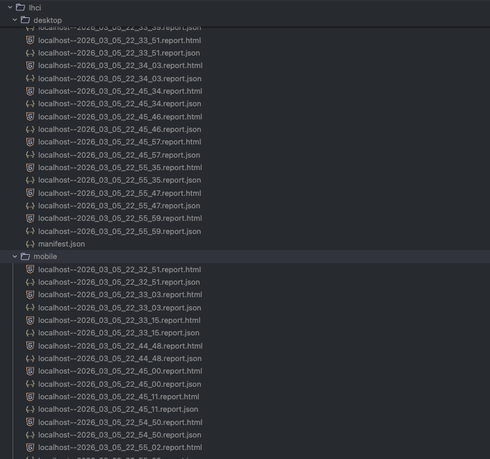 完了すると lhci フォルダ配下に、HTML / JSON レポートと manifest.json が出力されます。