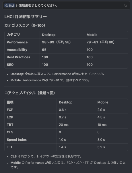 例えば、出力されたレポート一式をAIに見てもらい、「スコアが低い原因」「優先して直すべき項目」「モバイル/デスクトップ差分」などを整理してもらっています。